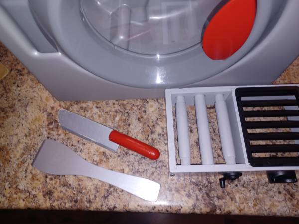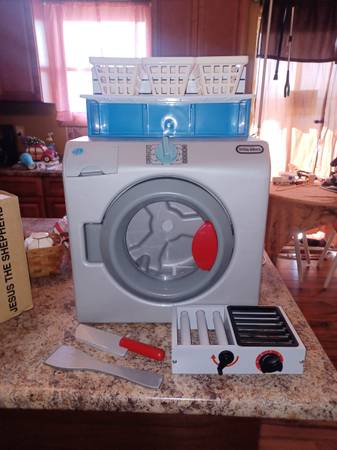 INTERACTIVE TOY This toy washer dryer is designed so kids can pretend they're doing the laundry as if they're using the real thing for hours of pretend play fun.REALISTIC DESIGN This washer dryer is packed with realistic sounds dial turning, spinning drum sounds, beeps, cycle changing, and more. Kids can even turn the dial to activate the spinning drum and watch it as it goes through a wash/dry cycle.ENCOURAGE IMAGINATION Pretending to do laundry and do other chores helps boys and girls gain a sense of responsibility while having fun at the same time.ACCESSORIES INCLUDED Includes 11 pretend play laundry accessories 3 baskets, 2 towels, 2 socks, 2 shirts, shorts, and a bottle of detergent.EASY SET UP Quickly sets up to its full size (15.5" wide x 11.5" deep x 20.6" tall), making it great for small spaces.