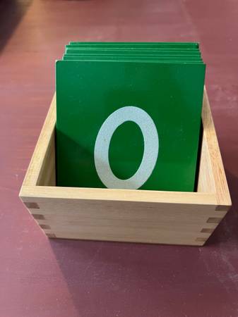 Montessori sandpaper numerals in wooden box-- 4 x 4 1/2. These are wooden tablets with the numerals in sandpaper to give children the tactile as well as visual feedback. Excellent condition.