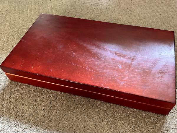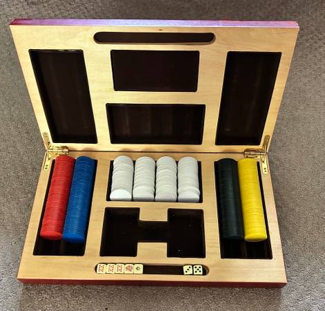 Poker chip set in a heavy decorative cherry wood display case. 400 chips in perfect condition. Case has a couple minor scratches. Also contains various dice. Does not come with playing cards.
