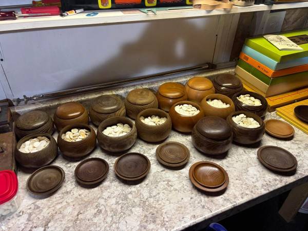 Japanese Go game equipment for sale. All used in very good condition. Prices vary for sets of shell & slate Go stones, wooden bowls, and folding wooden boards. $100-200....