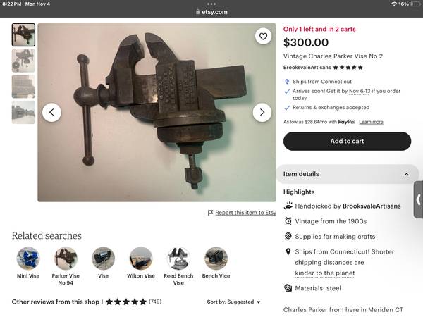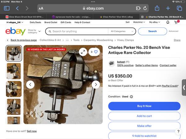 This is a very rare C.Parker, number 44, vise I’m selling as I now retired and have no use for it anymore. I’ve included the only pictures I could find on the internet of similar number 22 and number 20 vises that are for sale. Again, this is a larger more rare number 44 vise. Please see all pictures for verification.