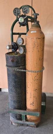 Complete set of Oxygen/Acetylene Cutting Torches. Privately owned tanks. Large tanks, Oxygen tank approximately 48" tall, Acetylene tank approximately 36" tall. Modified cart with steel bumper added to the front of the cart for increased safety, an auxiliary handle was added onto at the rear of the cart for easier maneuverability. Spark ignitor and acetylene tank valve key included with this set.