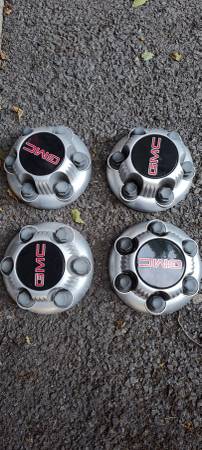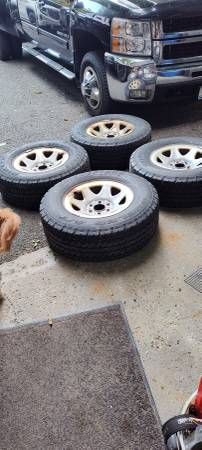 Set of 4 Bridgestone Dueler A/T M&S Tires on rims with TPMS sensors installed of 2109 GMC 1500 truck. TPMS sensor are 315 HZ so have to make sure your truck will read them. Pulled off due to new rims and tires would be great for winter tires. Plenty of tread low miles. See pics. Looking to get $100.00 or best offer. Also includes GMC hub caps in great shape