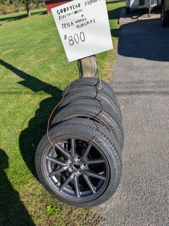 I have 5 goodyear electric vehicle tires for sale, they were used less than a thousand miles. Size is 235/45r18 and four are mounted on tesla wheels and come with four hub caps. delivery is possible
