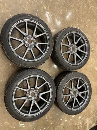 18” Aero wheels and winter tires from 2019 Tesla Model 3 Dual Motor. Old style TPMS. Used for 3 seasons. Wheels are in great shape and tires have most of the tread left.