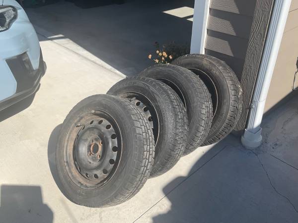 175/65R15 snow tires- 3 are Dunlop Wintermaxx’s, 1 is a Firestone Winterforce 2. All with good tread and on steel rims. To sell as a set of 4, $60 (cash only) for the set.